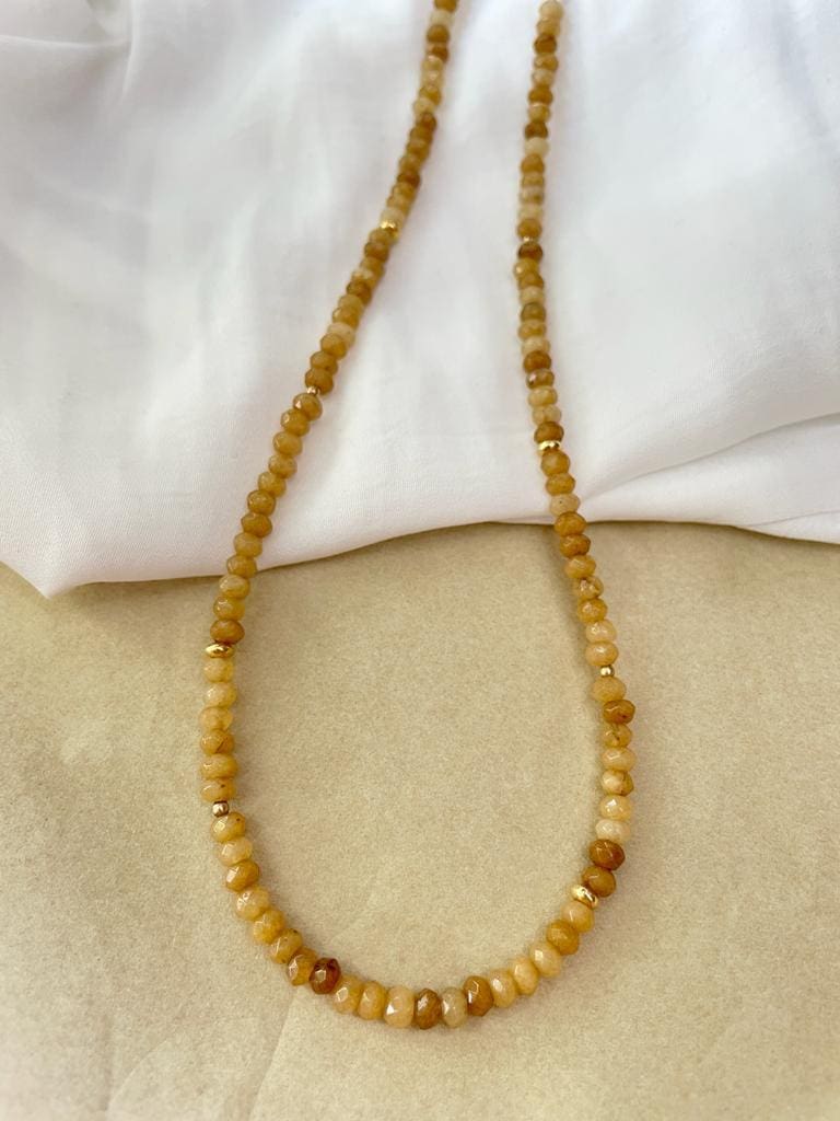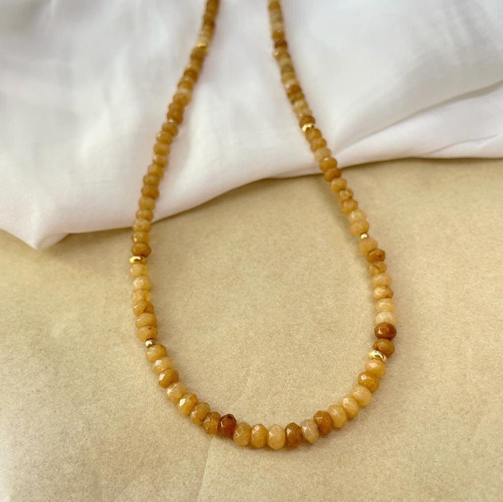 A stunning handmade mustard-colored necklace with gemstone beads.