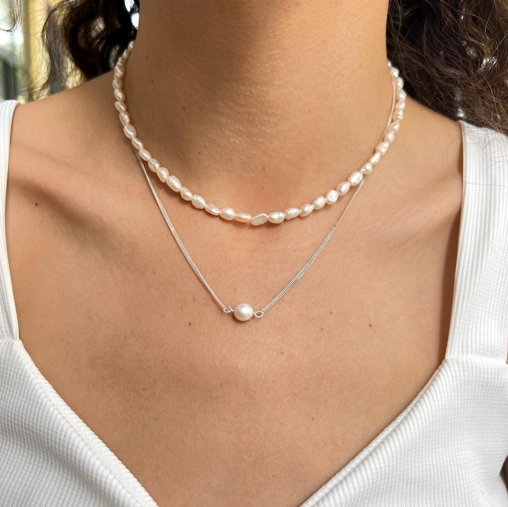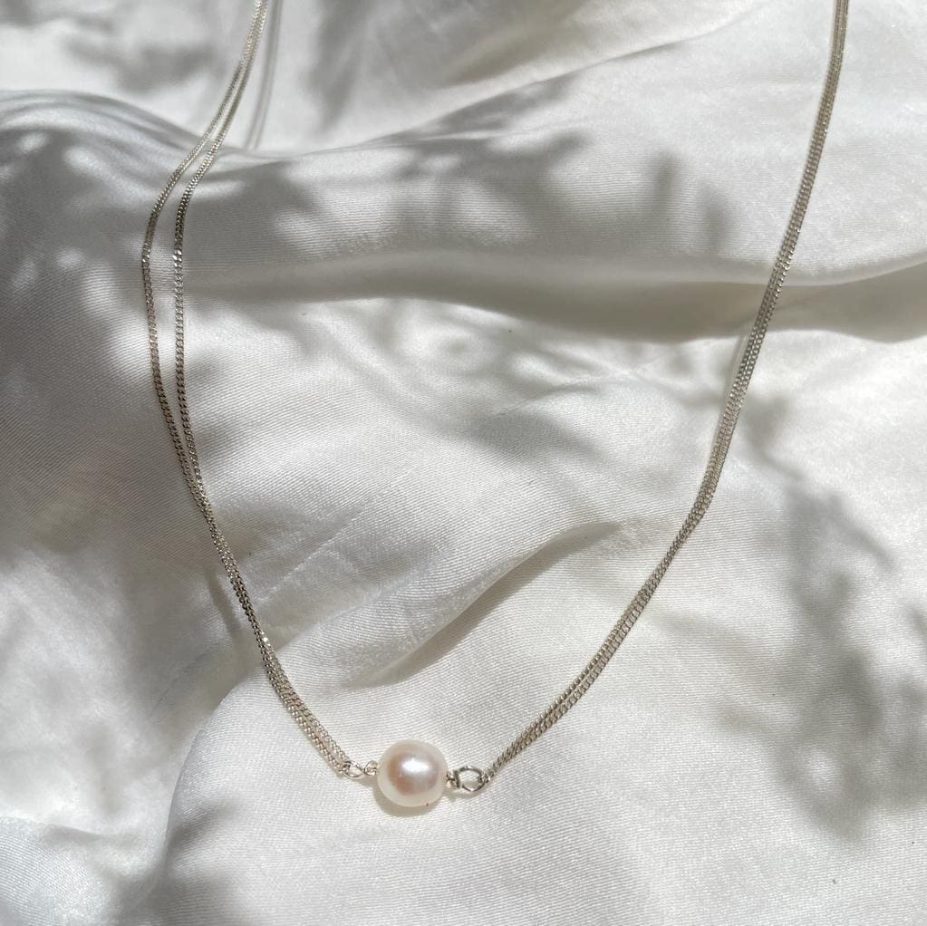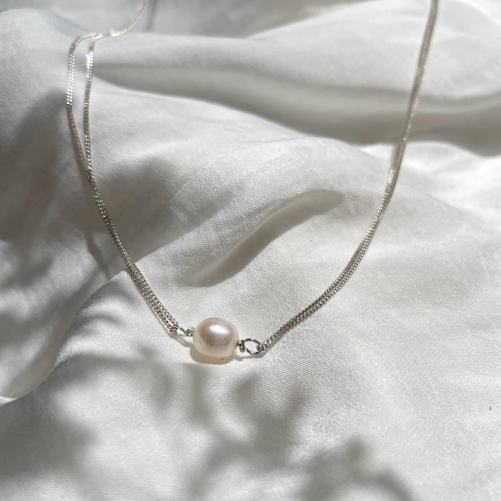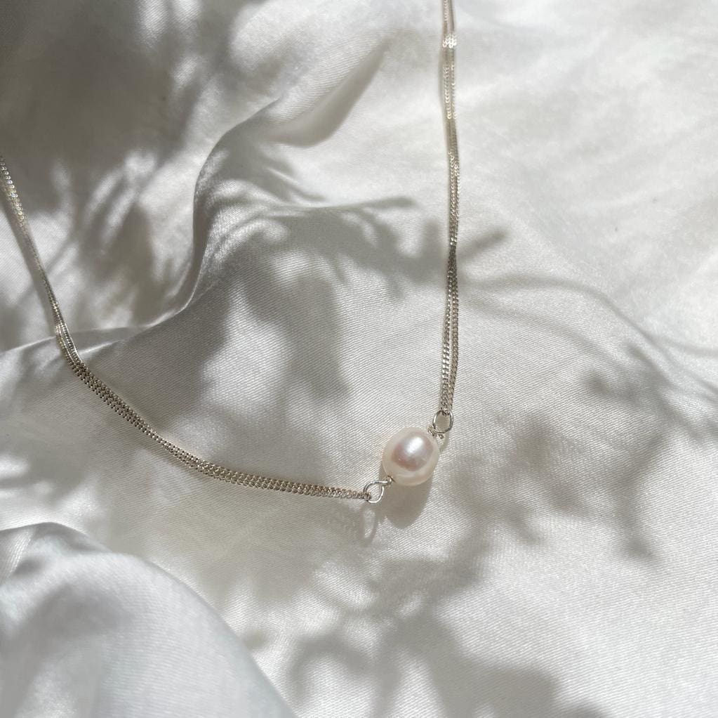 A necklace with a delicate and elegant presence, made of 925 silver and featuring a pearl pendant. You can shower and enter water sources without fear!